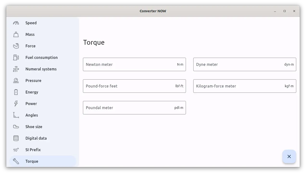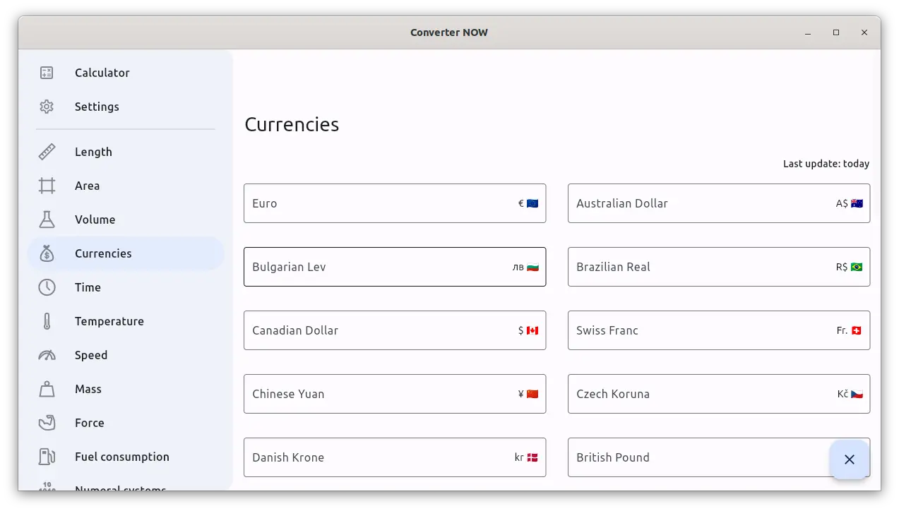 Except for updating the currency data, the tool can work completely offline. With it, you can convert following units all in one app window: