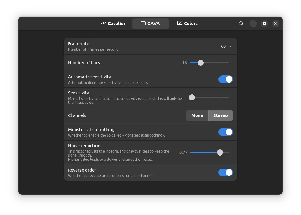 The app is based on the cross-platform cava audio visualizer. Other features include configuring the bar number, frame-rate, smoothing, noise reduction, as well as following settings: