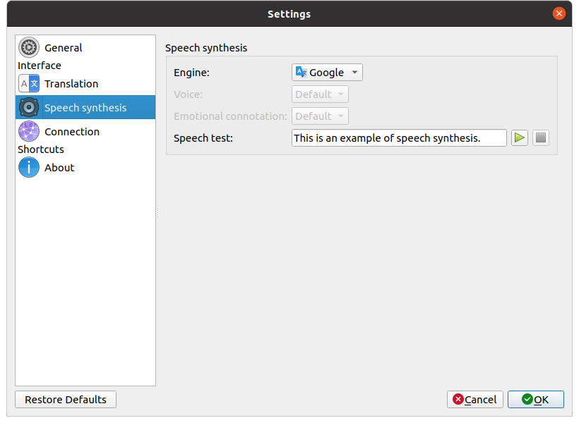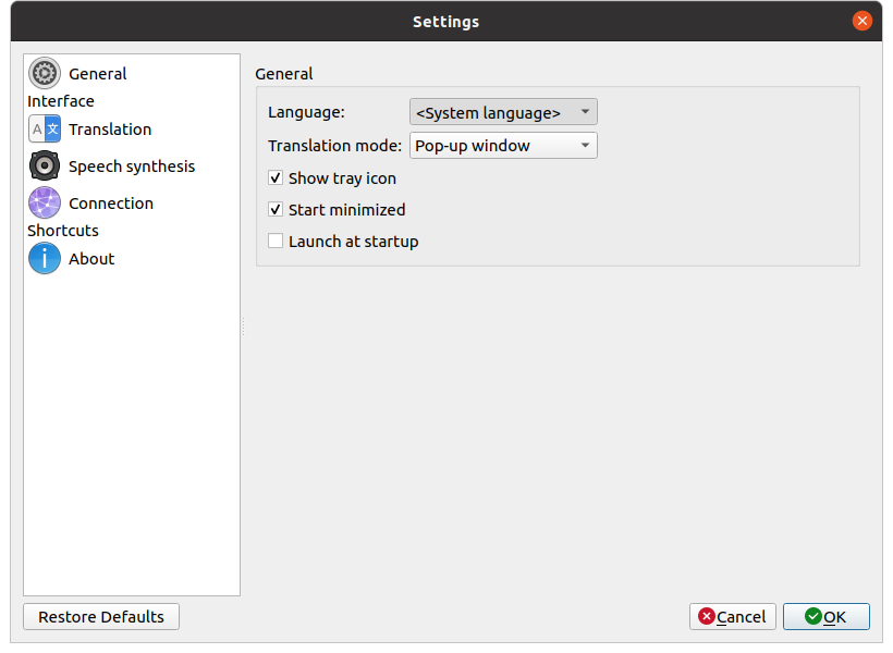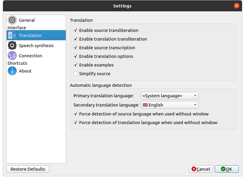 Crow Translate is written in C++ with Qt framework. It works on Linux and Windows, and allows to translate and speak text in 125 different languages.