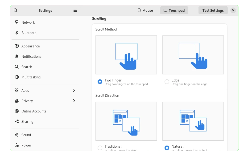 The Settings, also known as Gnome Control Center, has been revamped with clean and easy understand settings page for mouse & touchpad. Enable Wi-Fi hotspot now provides a QR code to make it easy to connect from mobile devices.
