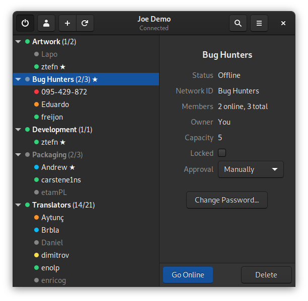 Haguichi is written in Vala with GTK+ toolkit. After installing Hamachi VPN client for Linux, it provides a graphical interface that features: