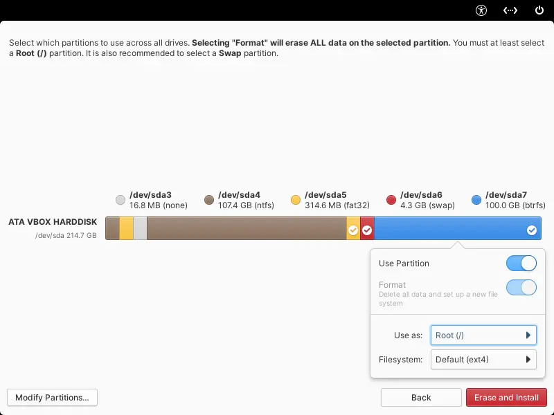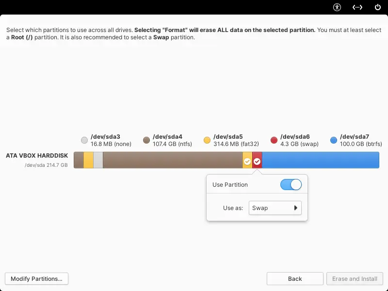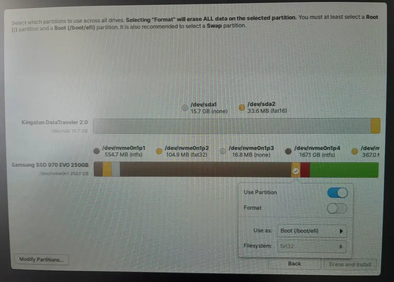 After that, also right-click on the “/boot/efi” partition you created and select “Manage flag” and set to “boot“.
