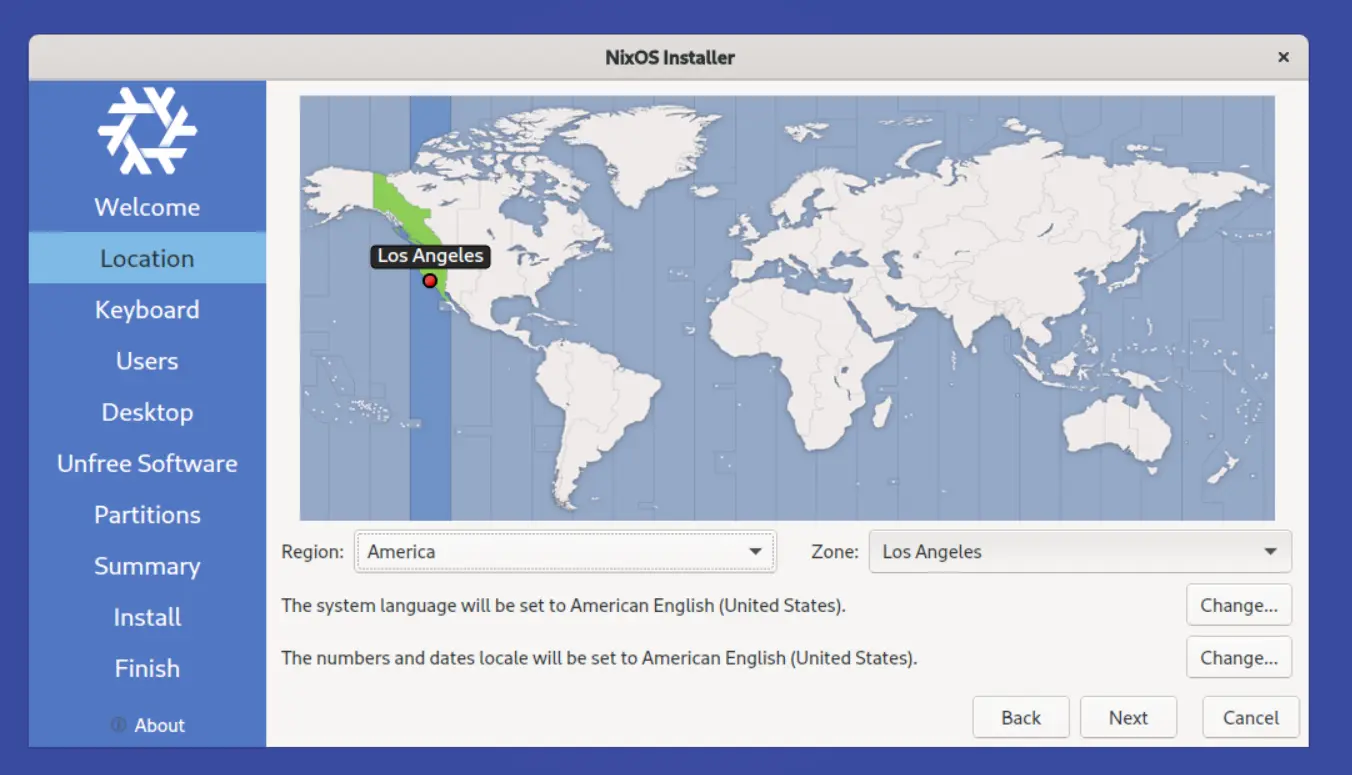 The first screens in the installer wizard are to setup the language, your location, and keyboard, etc.