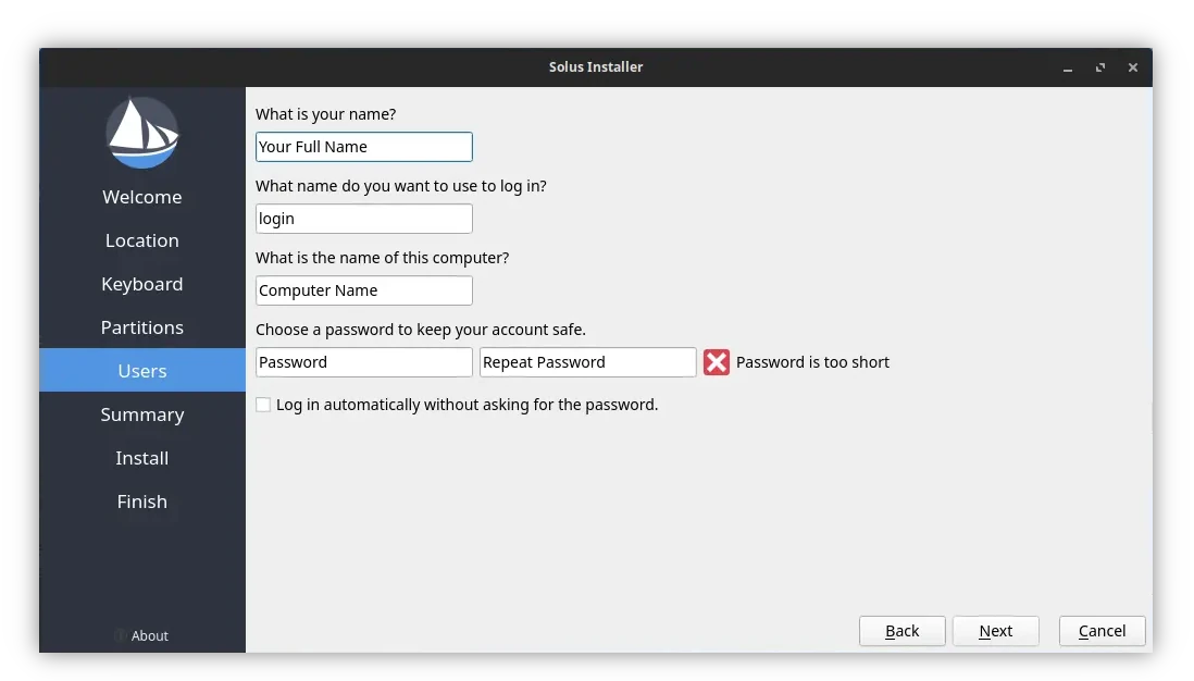 Finally, click “Next” and input your desired user-name, password, computer name. Then, confirm in the ‘Summary’ page, and finally click start installing the Solus OS: