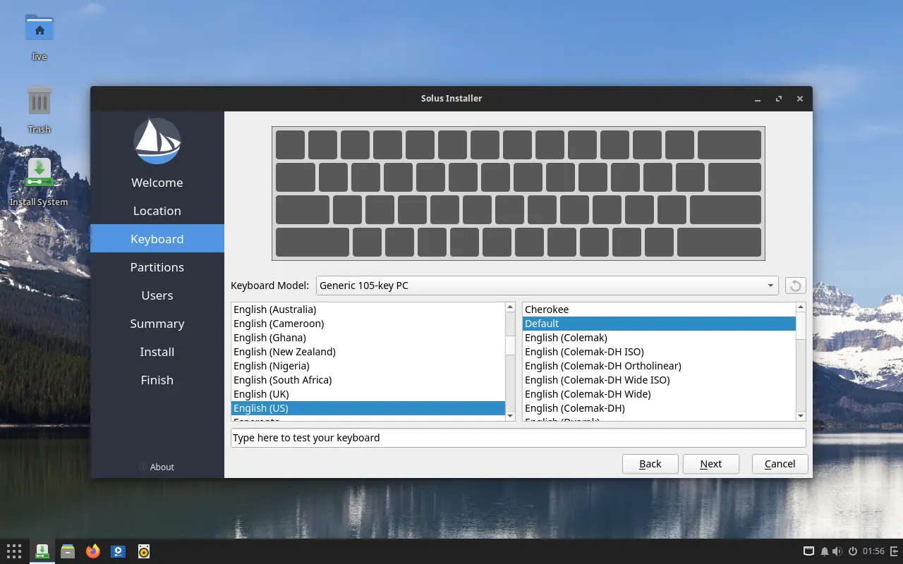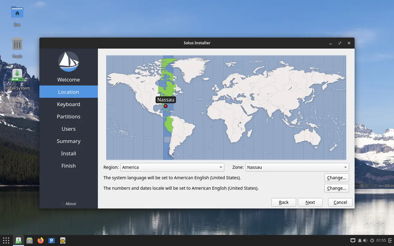 When the installer starts, choose language, your location, and keyboard layout in the first few pages: