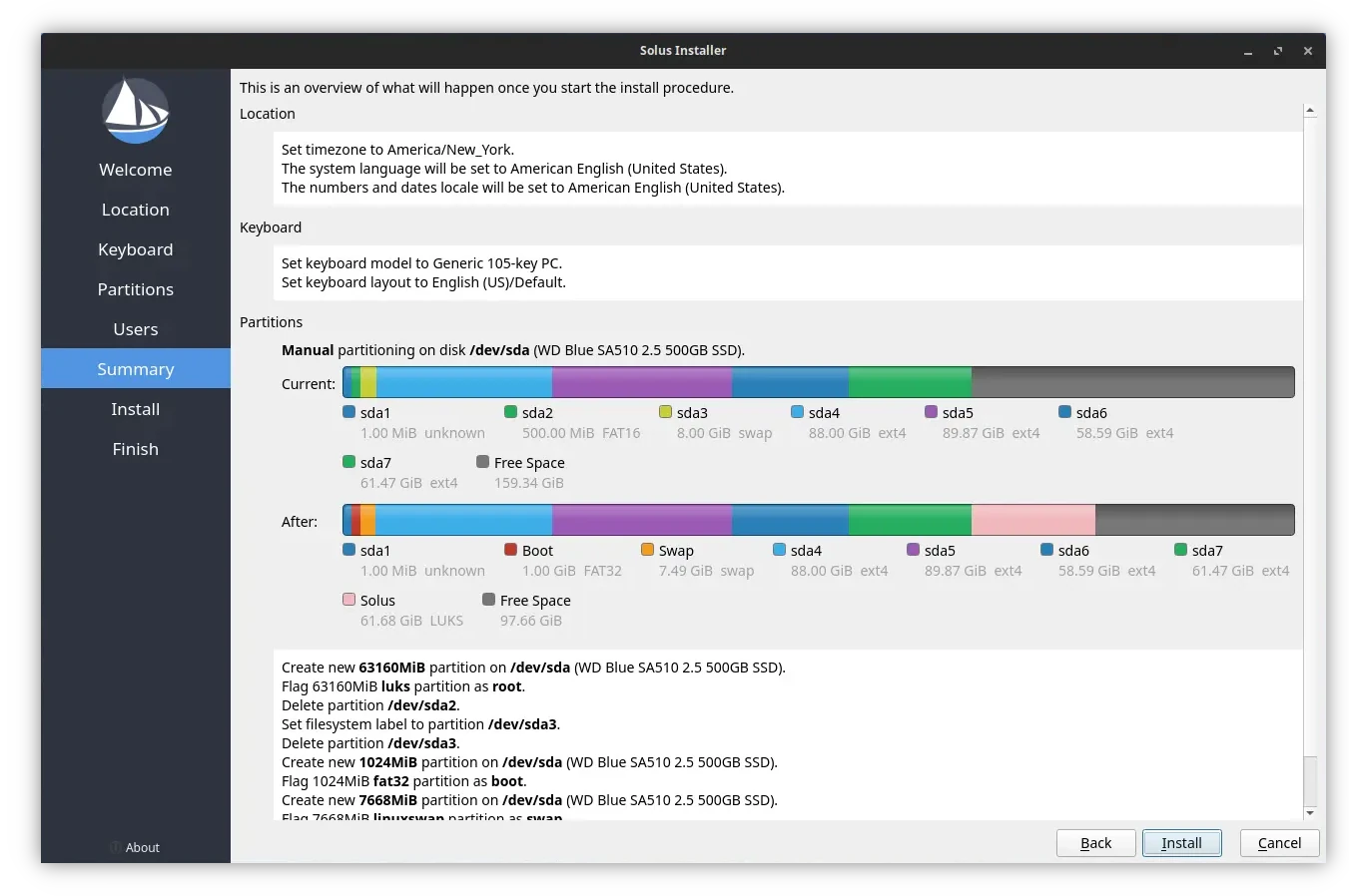 - Replace a partition – select a partition on the colorful bar, after “Current”, and replace it with Solus.