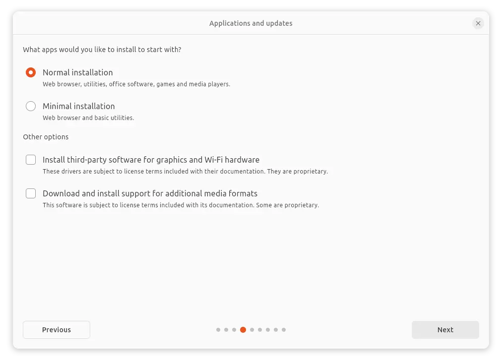 However, the “Default Installation” is a minimal installation, that excludes many apps, such as LibreOffice, Thunderbird, Rhythmbox, etc. Choose “Full Installation” if you prefer to the old default installation in previous Ubuntu releases.