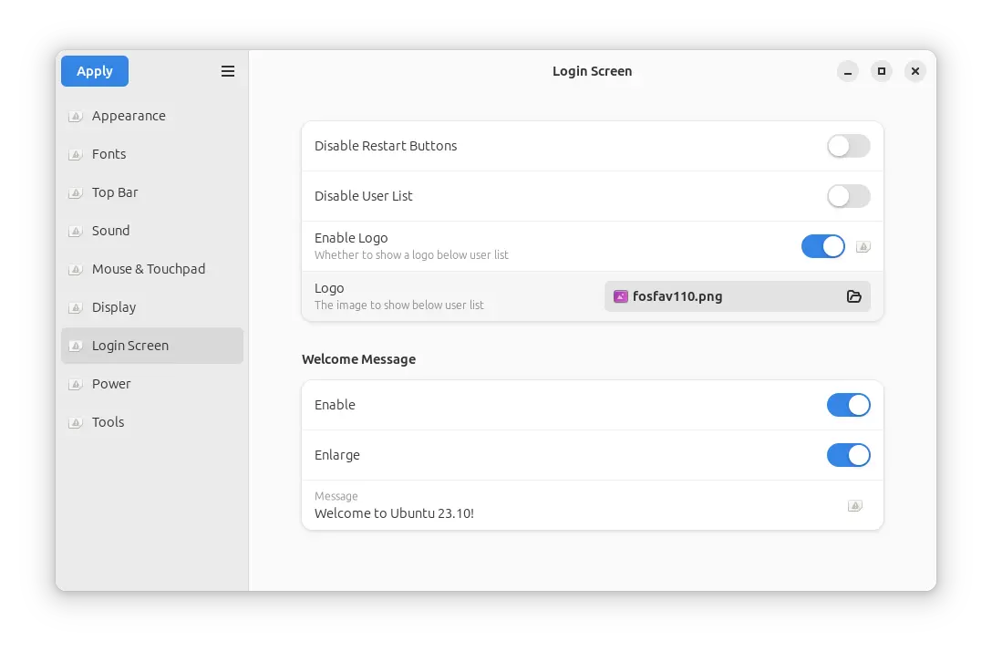 GDM Settings is a free open-source GTK4 tool for Ubuntu, Fedora workstation, and other Linux with GNOME Desktop. It provides a simple and easy to use user interface for configuring the login screen appearance and behavior.