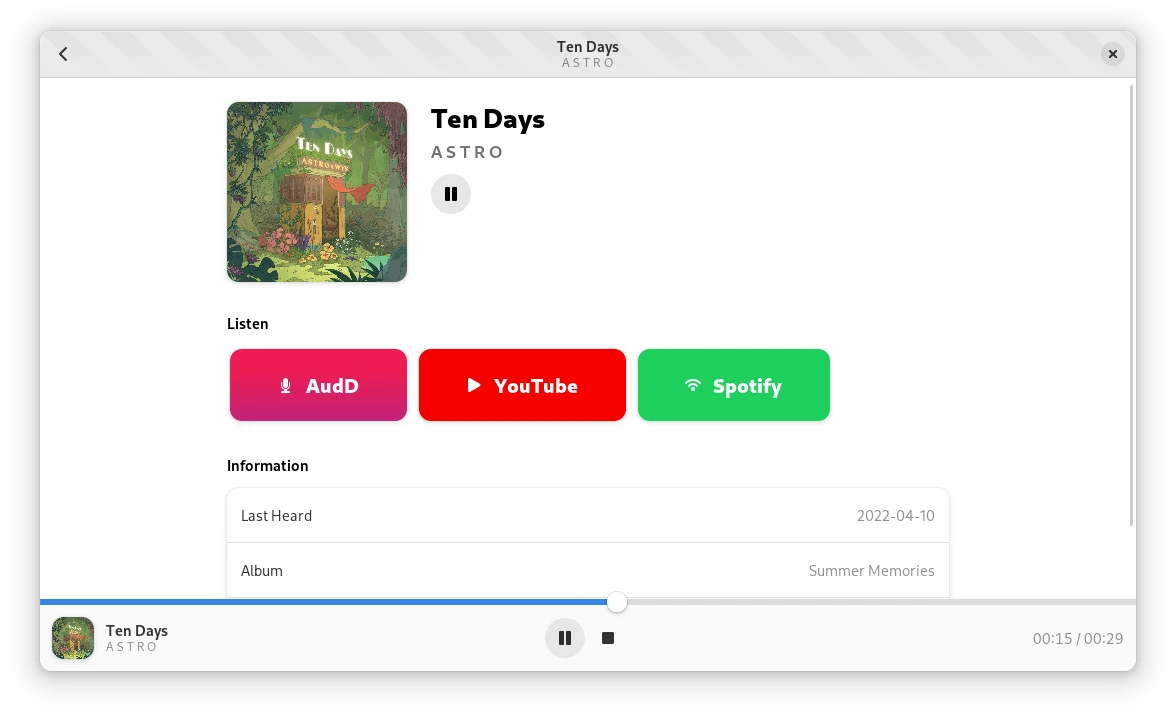 It shows the song name, artist (and album if available) automatically if successfully identify it. And, it shows the history songs along with button to replay and link to music in online sources, such as YouTube and Spotify.