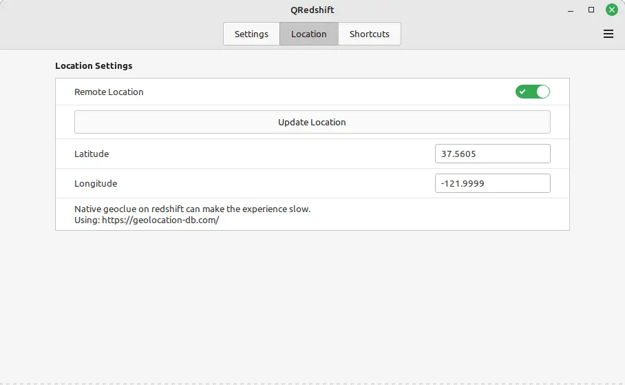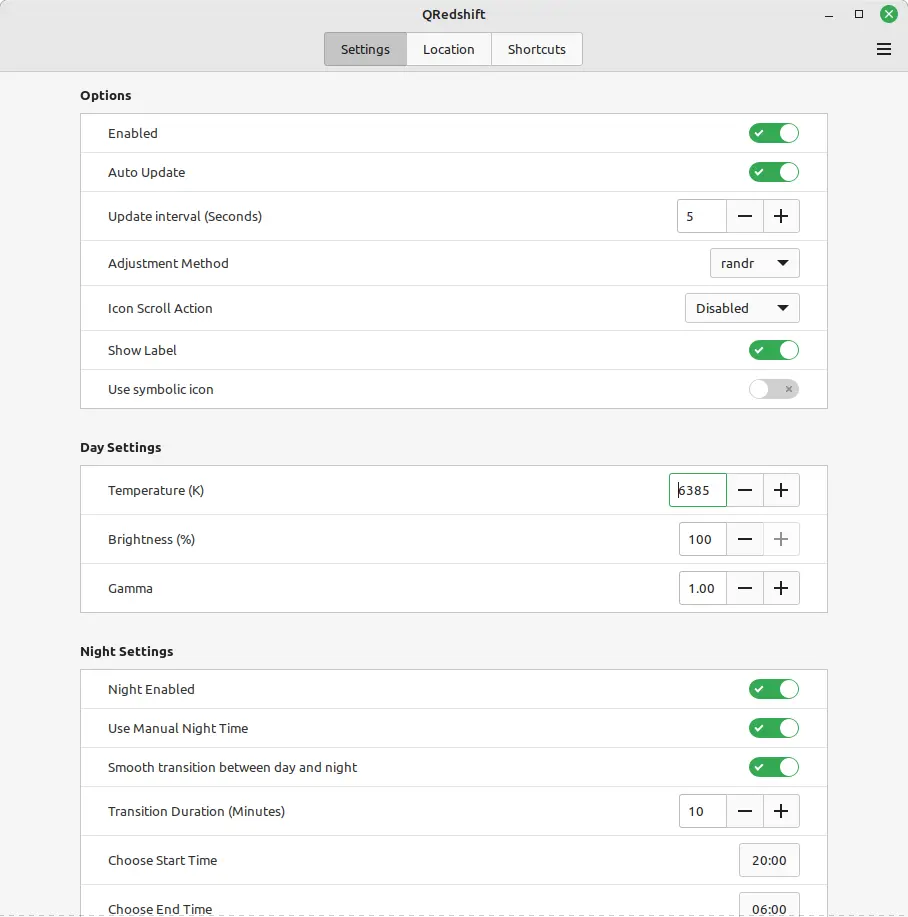 5. By clicking on the gear icon in menu will open a more detailed configuration dialog. There, you can set certain time period to start/stop the night color temperature, or set location (visit https://geolocation-db.com without proxy to see the latitude/longitude) to automate the feature.