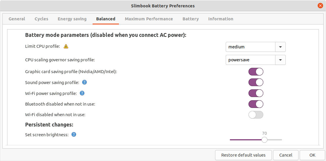 The software uses TLP for power saving profiles. For each power mode, it has options to customize the most important settings, including: