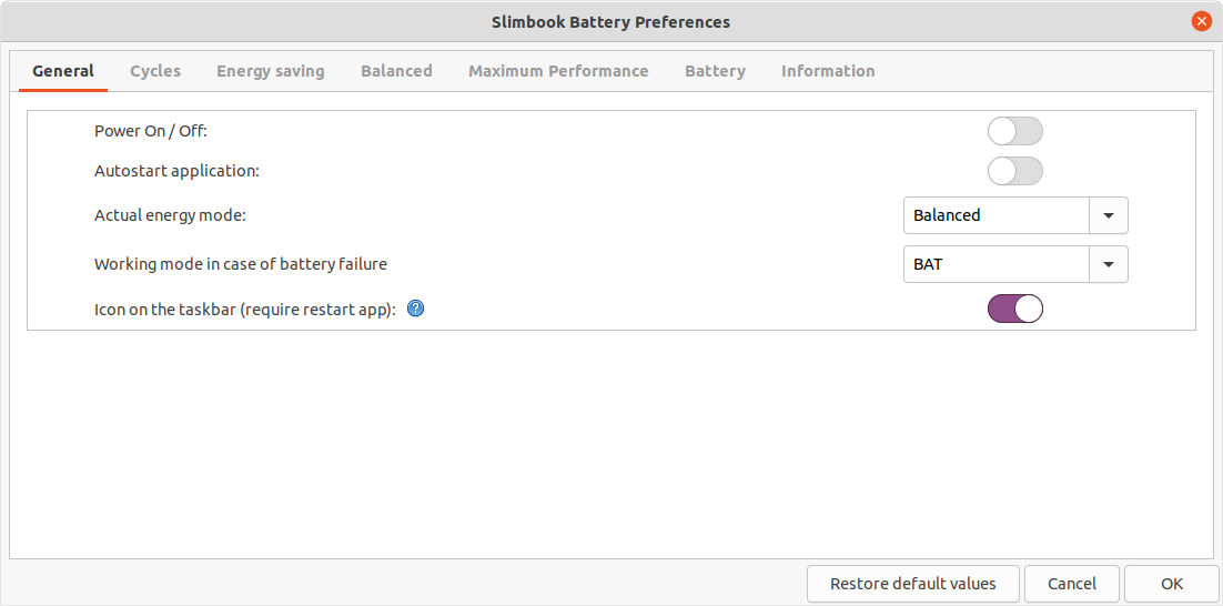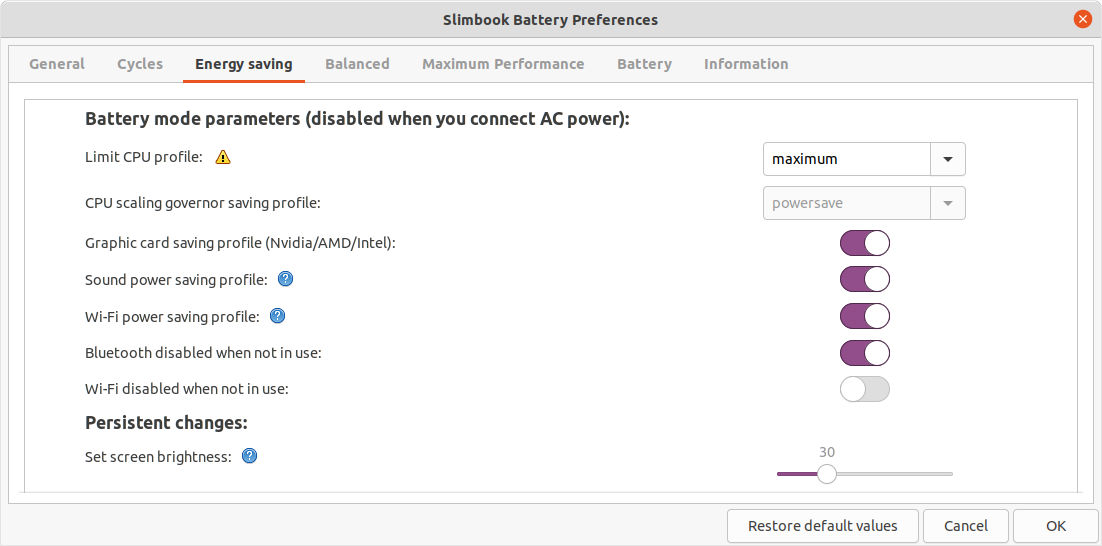 Slimbook Battery is a free software created by a Linux laptop and computer manufacturer from Spain. It provides a system tray indicator to easily toggle between ‘Energy Saving‘, ‘Balanced‘, and ‘Maximum Performance‘.