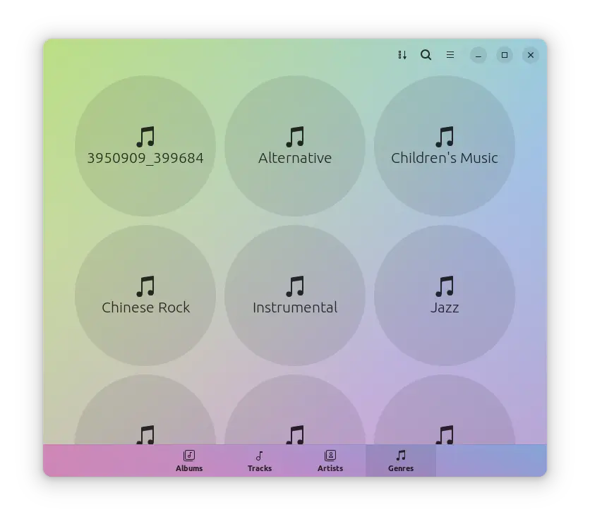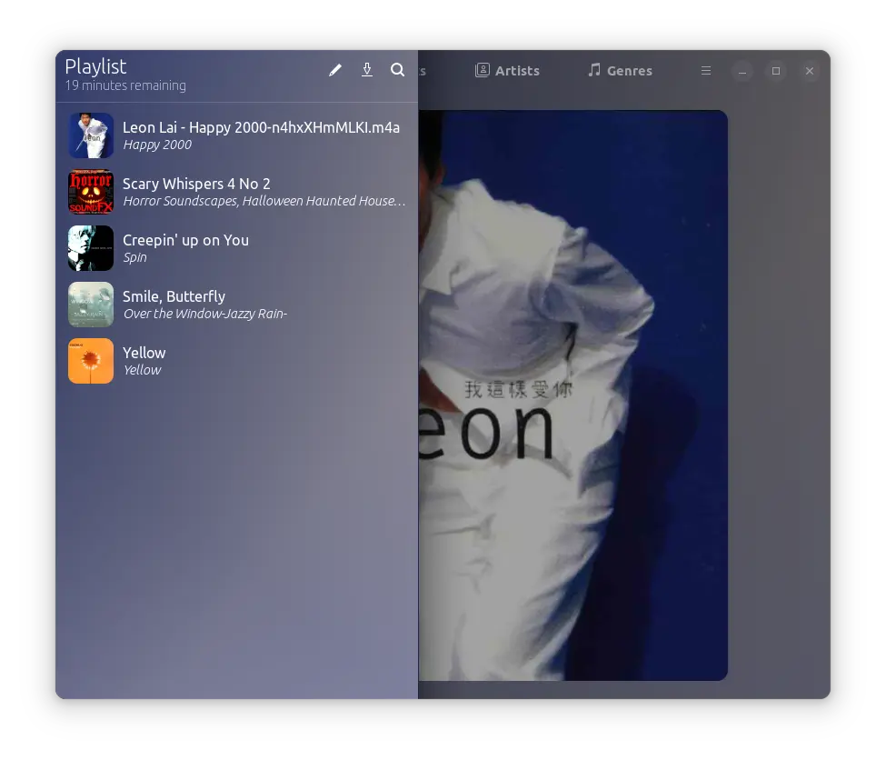 The player allows to manage your music collection in different tabs, including Album, Track, Artist, and Genre. It shows current selection and playlist in a sidebar. Which, is floating left or right depends on the app window size. And, it allows to use 2-finger swipe gesture to show/hide the playlist sidebar.