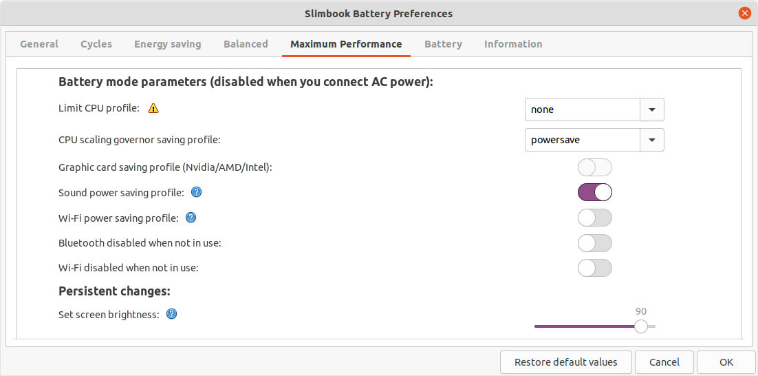 Slimbook Battery is a free software created by a Linux laptop and computer manufacturer from Spain. It has 3 presets based on TLP configurations and provides an indicator menu for easily switching among them.