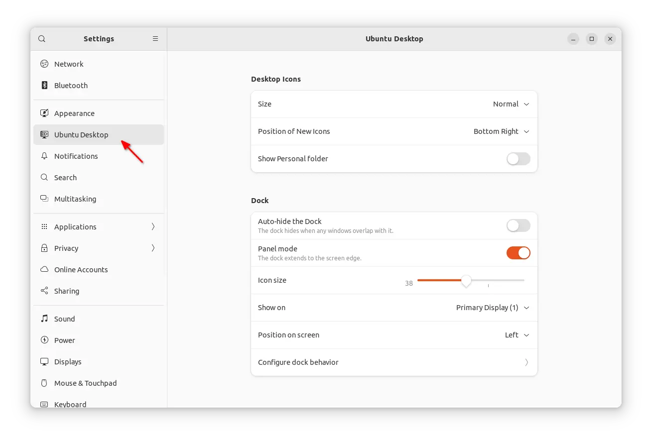 - New ‘Ubuntu Desktop’ settings to configure Dock & Desktop icons, that were previously in ‘Appearance’.