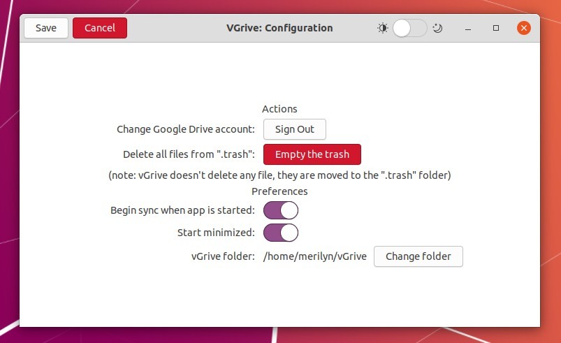 By default, it creates a vGrive folder in user’s home directory and sync files between your Google Drive and this local folder. You can change the local folder from the preferences window.