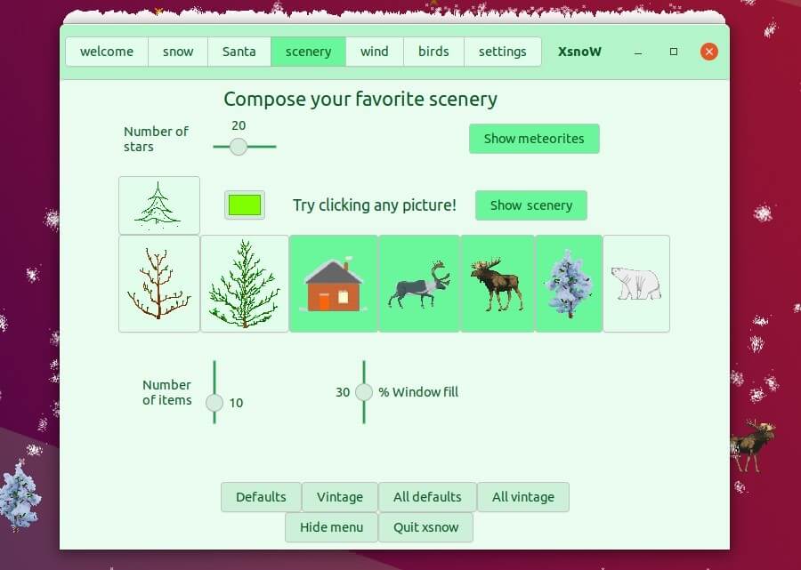 After installed the package, just search for and launch “xsnow” from start menu and enjoy!